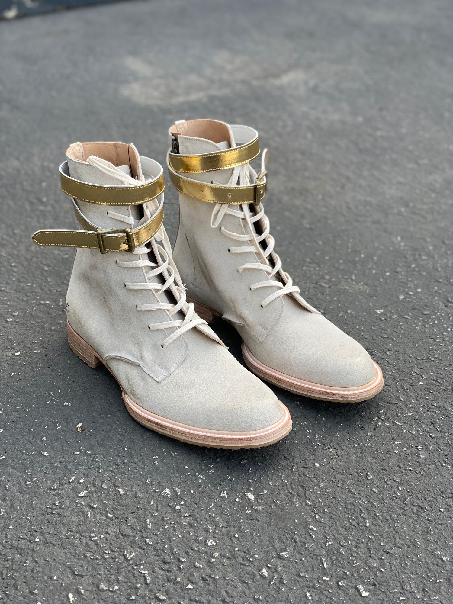 • Upon confirming the basics such as material and colors, you’ll have the option to personalize your shoes with monograms, date plaques or graphic tattoos. To satisfy more practical needs, you may ask us to add a rubber topper to your shoes for better stability and traction in wet weather.